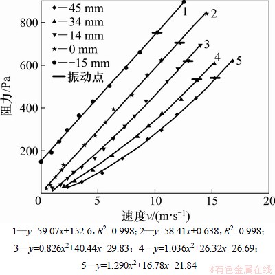 除尘器固有频率与除尘器风机转动频率会在一定转速下耦合发生共振,威胁到除尘器运行安全,实验知,除尘风机运行频率在44.8~45.6 Hz时,除尘器机械振动振幅明显加大,并发生异常声响,图4中“振动点”位置为各b0时除尘器开始发生共振现象的速度位置(速度分别为15.28,13.68,12.90,12.21和10.23 m/s),进一步分析可知:除尘风机叶轮旋转的不平衡惯性力是产生共振的激励作用力。因此,除尘器应避免运行在共振频率区间内。