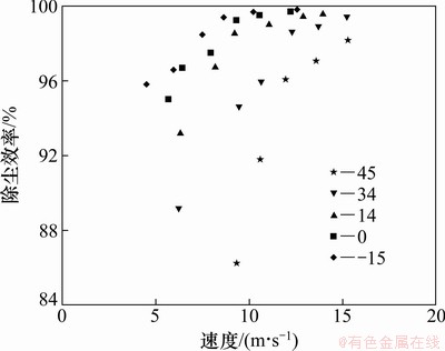 除尘效率实验所选粉尘为某烧结厂皮带输送转运点布袋收尘除尘灰中粒径小于106 μm的粉尘,其中,D16<11.67 μm,D75<38.97 μm,D90<53.03 μm,D98<71.11 μm,粉尘堆积密度1.13 g/cm3,FC-1A型粉尘采样仪采集除尘器出口粉尘浓度。