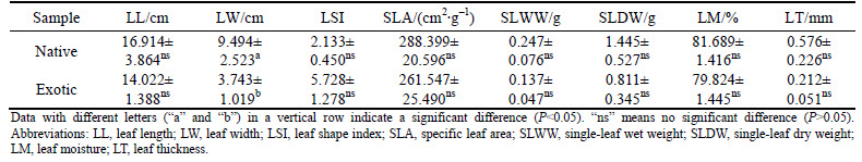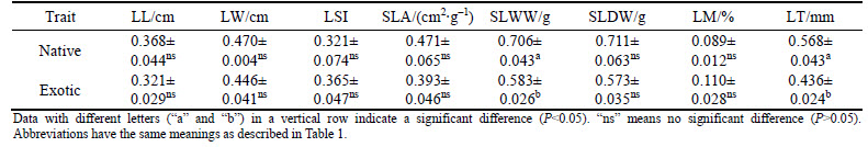 The plasticity indices of single-leaf wet weight and leaf thickness of exotic plants were significantly lower than those of native species (Table 2, P<0.05). Meanwhile, the plasticity indices of leaf length, leaf width, and SLA of exotic plants were also lower than those of native species, but not significantly (P>0.05). The plasticity indices of leaf shape index and leaf moisture of exotic plants were higher than those of native species, but not significantly (P>0.05).