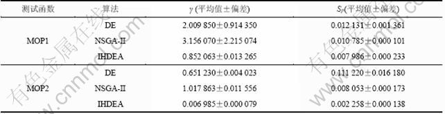 由表1可见:对于MOP1和MOP2,在收敛性方面,IHDEA的逼近性明显优于DE和NSGA-II,说明DE与PSO的结合提高了传统DE算法的搜索效率;在分布性方面,IHDEA对改善Pareto最优解集多样性的效果比较明显,尤其要比NSGA-II优越,说明基于多种群进化的信息交换策略优于NSGA-II的拥挤距离判断方法。2个测试函数的计算结果表明:IHDEA对于求解复杂非线性多目标优化问题具有明显的优势。