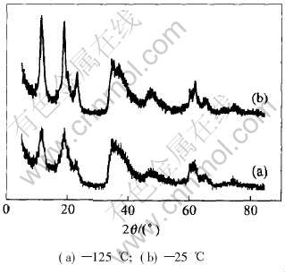 传统的配锂方式是把共沉淀产物洗涤干燥后和相应量的LiOH混合研磨, 并烧结而成。 但由于共沉淀产物在干燥过程中Ni、 Mn沉淀物会发生氧化, 特别是Mn(OH)2在空气氛高温条件下容易生成锰氧化物[5], 这样不但影响了共沉淀物的设计组分, 还可能导致配锂量不准确, 从而最终影响了产物的循环性能。 作者对材料不同温度下干燥的沉淀产物作了X射线衍射分析, 结果如图1所示。 可以看出, 低温干燥的前驱体(图1(b))各衍射峰比较尖锐, 毛刺较少, 说明低温下干燥的产物基本保持了设计组分。 高温干燥的产物(图1(a))各衍射峰相对变得宽大, 毛刺较多。 说明在高温条件下干燥的材料发生了一定的氧化和脱水现象, 共沉淀产物已不再是纯洁的(Ni0.5Mn0.5)(OH)2成分。