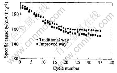 通过以上分析, 对配锂方式做了改进: 首先称量好所需的LiOH, 然后将其混入洗涤后的共沉淀产物中, 以酒精作研磨介质混匀两种物质并在低温下(25℃)充分干燥后制备出前驱体。 为了证明前驱体制备方式对材料性能的影响, 分别作了不同配锂方式制得材料的充放电循环曲线。 图2所示为其它条件不变, 配锂方式改进前后所制备材料的放电循环比较。 可以看出, 采用改进的配锂方法, 材料的容量和循环性能都有了一定的提高, 说明预混配锂和低温干燥的方法一定程度上克服了共沉淀产物的氧化现象, 同时也保证了材料配锂量的准确, 对材料的电化学性能有着积极的意义。