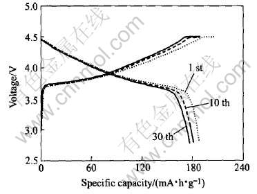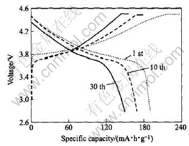 处于3a位置的Li+如果要占据Ni2+的3b位置需要外界提供能量和一定反应时间, 因此在低温下烧结(≤800℃)Li+和Ni2+混排现象没有高温下严重。 但是材料必须经过高温烧结才能形成完善层状固溶体结构(X射线衍射谱证明了低温条件下烧结得到的材料层状结构峰不明显), 为此, 作者选择了高温分段烧结的合成方式, 即烧结过程中首先在750℃下保温6h, 以保证各中间相产物的形成(在热重-差热曲线中观察到在750℃附近有明显的吸热峰, 和材料各中间体的形成有很大关系)。 然后再升温到950℃保温3h, 以促进材料的层状固溶体结构发育完全。 将这种条件下烧结出的产物作充放电实验(见图4), 从循环性能来看, 采取该方式合成的材料与一次高温烧结方式相比, 首次效率和循环性能都有了明显的提高, 首次效率达到80%以上。 30次循环后放电容量基本保持在175mA·h/g左右。 说明采用改进后的烧结方法收到了比较好的效果。