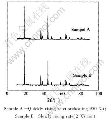 图5所示为不同升温速率不同时所合成材料的X射线衍射谱。 可以看出, 采用缓慢升温所合成材料的特征峰(Sample B)比采用快速升温合成材料的特征峰(Sample A)更为尖锐且(018)峰和(110)峰分叉相对较为明显, 说明缓慢加热能够使材料结晶更完善, 这样材料的性能应该相对较好。 同时根据X射线衍射数据计算出材料的晶格常数和I003/I004比值列于表1。
