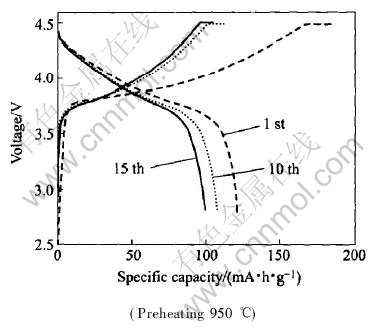 图6 急速升温(预热 950℃烧结)所制得产品的充放电循环图