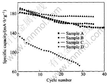 表2列出4种不同的制备条件。 图7所示为在几种条件下制备出材料的循环性能对比。